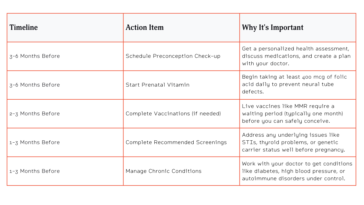 As you can see, the groundwork starts several months out, with the key medical appointments happening closer to when you plan to officially start trying.