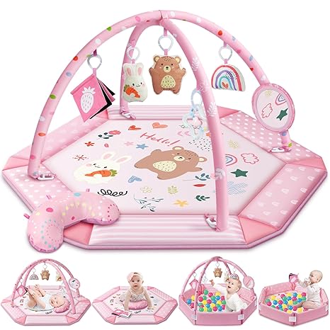Baby Gym Play Mat, 8-in-1 Tummy Time Mat & Ball Pit with 6 Toys, Washabl...