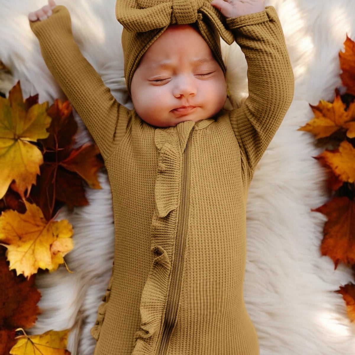 Organic Waffle Ruffle Zip Footie, Honey