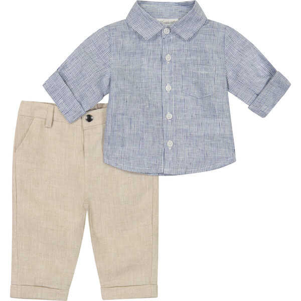 Linen Button Down Shirt & Pant Set, Blue - Miniclasix Pants | Maisonette